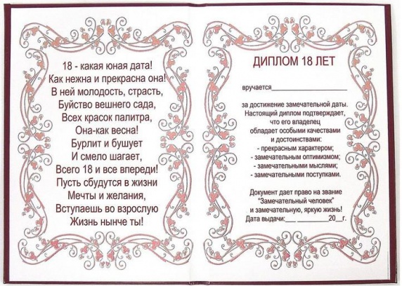 Диплом Эврика 18 лет - это способ торжественно поздравить юбиляра. Он останется на долгую память, поэтому вы можете вложить сюда лист с пожеланиями.